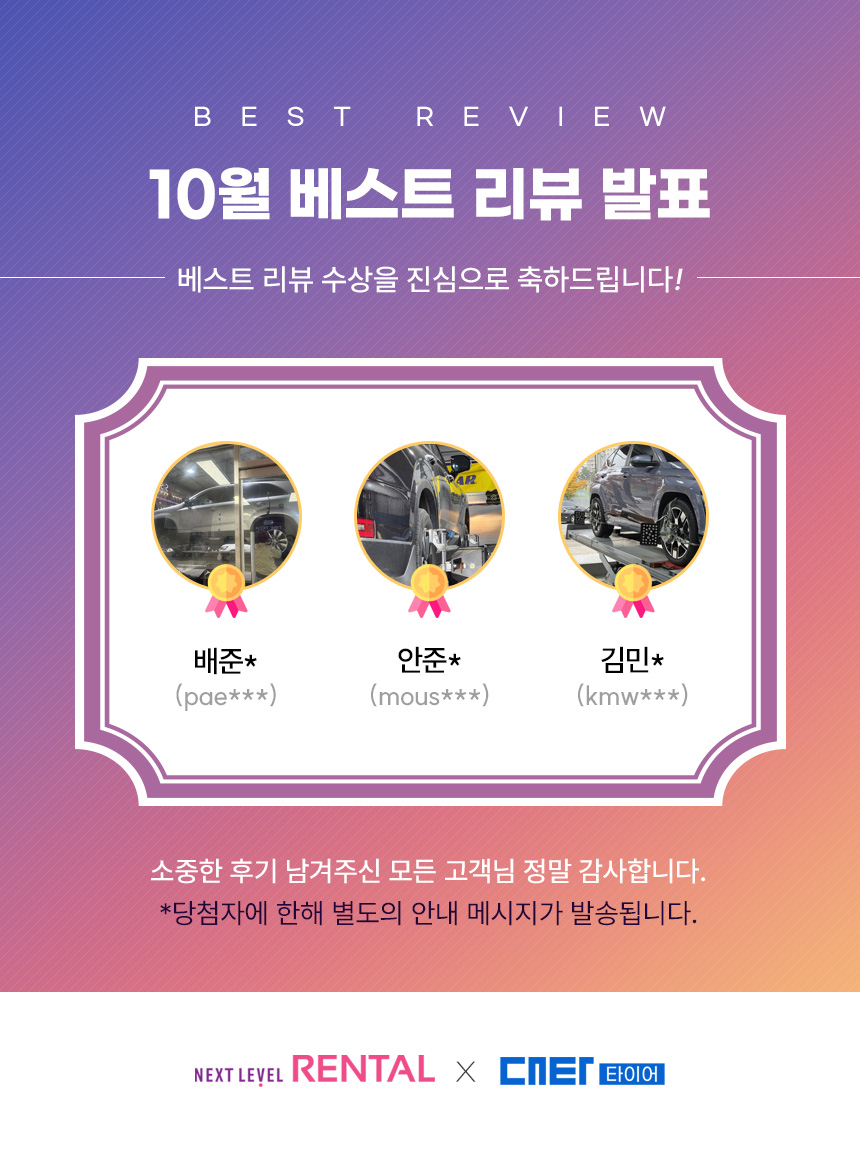 그동안 많은 사랑을 받았던 타이어렌탈 베스트 리뷰 이벤트가 2024년 10월로 마무리됩니다.